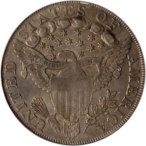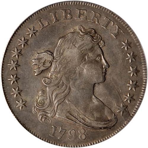 <b>1798 Draped Bust Dollar. Large eagle, close date. PCGS graded VF35.</b> A late die state of this obverse with sprung die (bulge in the right field) and the die breaking at the 13th stars. The bulge in the die left a partially uneven strike on Liberty's hair curls and at the central part of the shield on the reverse. Attractive russet and gray color with only a small rim bump above the second S in STATES. Very choice fields and devices <b>(PCGS # 6873)</b>