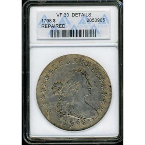 <b>1798 Draped Bust Dollar. Large eagle, close date. ANACS graded Details of VF30 Repaired.</b> Cleaned and allowed to retone, which has been accomplished but without much success as shown. Yet the major details are clearly represented, including a sharp date and full stars <b>(PCGS # 6873)</b> <i>