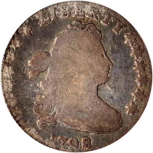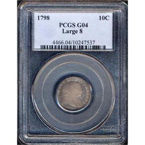 <b>1798 Draped Bust Dime. Large 8. PCGS graded Good 04.</b> Another early dime from this collector's set by date, this has smooth surfaces and most of the main devices present including a full date. The reverse is a little sharper than Good <b>(PCGS # 4466)</b> <i>