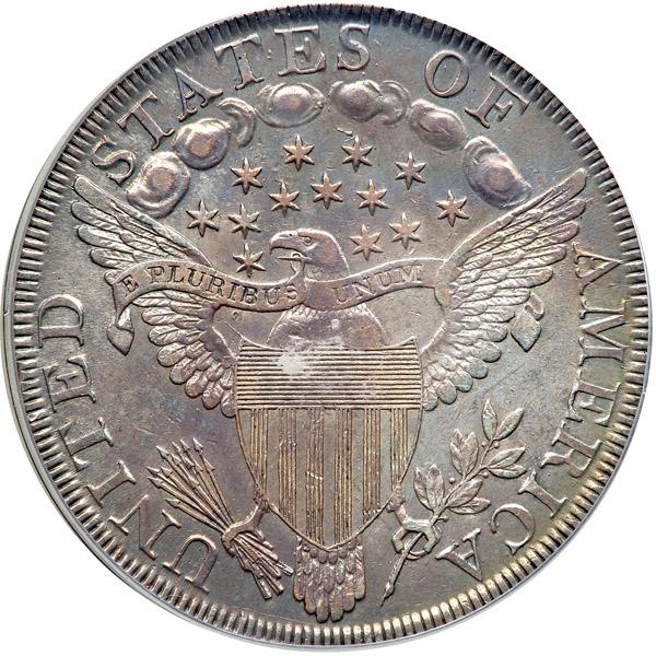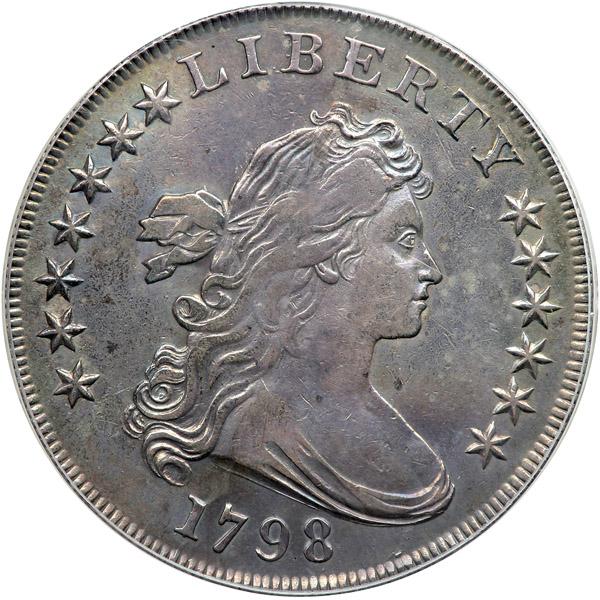 1798 Draped Bust Dollar. Our grade is Sharpness of AU. Cleaned. Each side is deeply toned displaying gold, magenta, blue, and russet colors. Pointed Tail 9; Heraldic Eagle. 1798 BB-106 is one of the rarer varieties of the year. An estimated 80 to 140 exist. Arc star pattern on reverse. From Obverse 8: Wide date, distant from bust. Upper left star near L. Upper and lower right stars equidistant from Y and bust. First star points to lower edge of a denticle. On the left, stars are about equally spaced. On the right, stars 12 and 13 are slightly farther apart than are other stars, which are fairly evenly spaced. Vertical die crack down through stand of E in LIBERTY, across bust through 1 of date to border. Obverse die used to strike 1798 BB-106 only (PCGS # 40023) .
