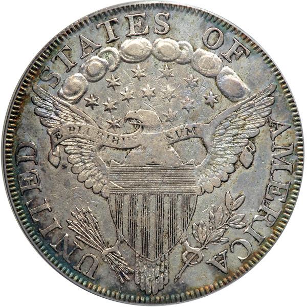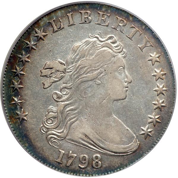 1798 Draped Bust Dollar. PCGS graded AU-50. Housed in a new secure plus holder. Pop 1; none finer at PCGS for the variety. The obverse exhibits shades of russet, violet, and blue-green about the borders while the reverse displays similar hues scattered throughout. A long adjustment line crosses the reverse from O(F) through the scroll and into the shield below, which will serve as an identifier of this particular specimen.