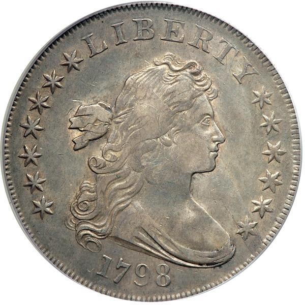 1798 Draped Bust Dollar. PCGS graded EF-45. Housed in a new secure plus holder. Pop 2; none finer at PCGS for the variety. A trace of golden toning accents the luster in the protected areas quite nicely. The rest of the coin exhibits soothing antique gray coloration. A small mark above the hair ribbon serves to identify this coin.