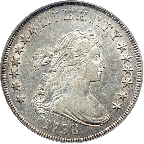 1798 Draped Bust Dollar. PCGS graded AU-55. Subset of PCGS # 40018. In a new secure plus holder. Condition Census. A showy specimen with a cocktail of underlying luster, frosty to satiny, that breathes scorching life into the highlights, which are nicely struck with crisp details aplenty. Perfectly centered on a superior planchet, the successful bidder will likely spend hours and hours admiring his new acquisition. An historic time in American history. John Adams was President at the time this was made. Pop 2; none finer at PCGS for the variety (PCGS # 40041) .