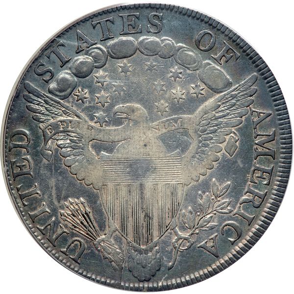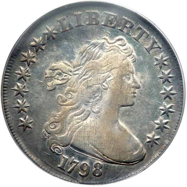 1798 Draped Bust Dollar. PCGS graded VF-35 PQ. Subset of PCGS # 40018. In a new secure plus holder. Another respectable example from the 1798 emission, and of the most advantageous order for a collector due to its overall choiceness. Its high degree of medium to dark toning rises and falls around and over the highlights. Nicely struck, too, with just a small amount of weakness at the usual Achilles' heel in a vertical band across the centers on both sides (PCGS # 40035) .