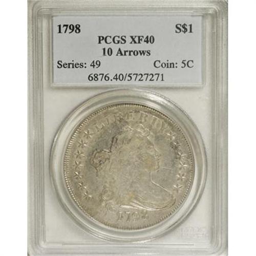 <B>1798 $1 Large Eagle, Five Stripes, 10 Arrows XF40 PCGS.</B></I> B-6, BB-96, R.3. Bowers-Borckardt Die State IV. A die crack is present above the I in AMERICA, but the two sticks without arrowheads remain visible. This lightly toned example has occasional glimpses of tan toning on the devices. Luster emerges from the eagle's wings and the reverse legends. The strike is slightly soft near the eagle's head, but there are no remotely mentionable marks.<BR><I>From The Vanek Collection.3</B></I><BR><BR><b>Shipping:</b> Coins & Currency (<a target="_blank" href="http://www.heritageauctions.com/common/shipping.php">view shipping information</a>)