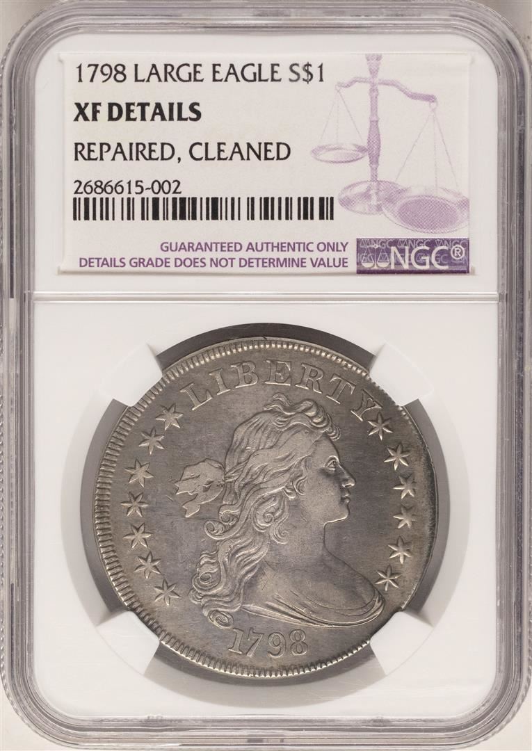 One 1798 Large Eagle $1 Draped Bust Silver Dollar Coin NGC XF Details. NGC Certified.