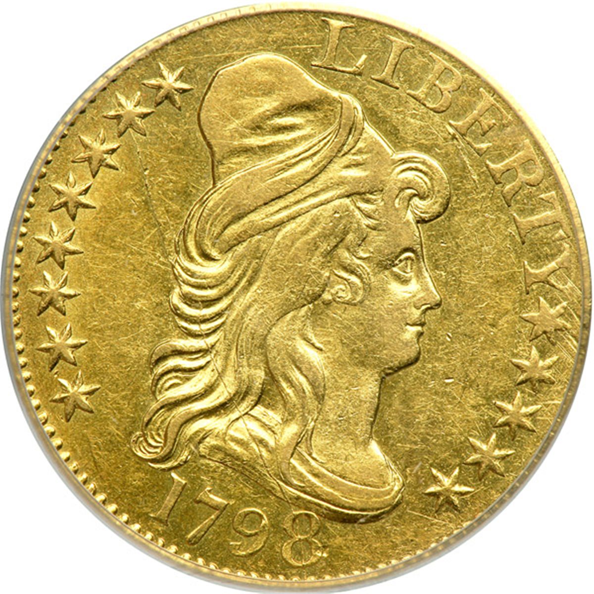 1798. Large Eagle, Large 8, 13 Star Reverse. PCGS graded AU-53. Interesting die breaks. Mostly untoned. Well struck on the main devices; what's more, the coin survived 200 years of use (and coin collector stewardship) free from injury, almost a marvel in itself!