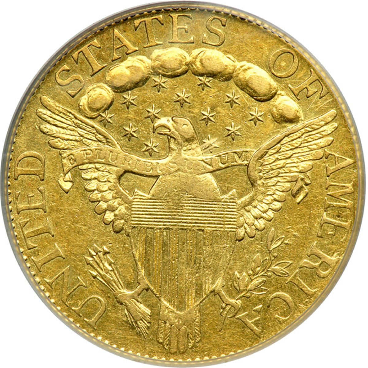 In BD-5, the date is wide with 89 level; the stars on the reverse arranged in a perfect cross pattern. This is an early half eagle variety that is very scarce, according to the Dannreuther reference, "one that many would consider rare with a few more than two dozen coins extant. The obverse must have failed rather quickly…and the reverse is paired with a 1799 obverse to create BD-2 of that date." RARE 1798 LARGE 8 HALF EAGLE VARIETY, BD-5, RARITY-5+ (PCGS # 8078) .