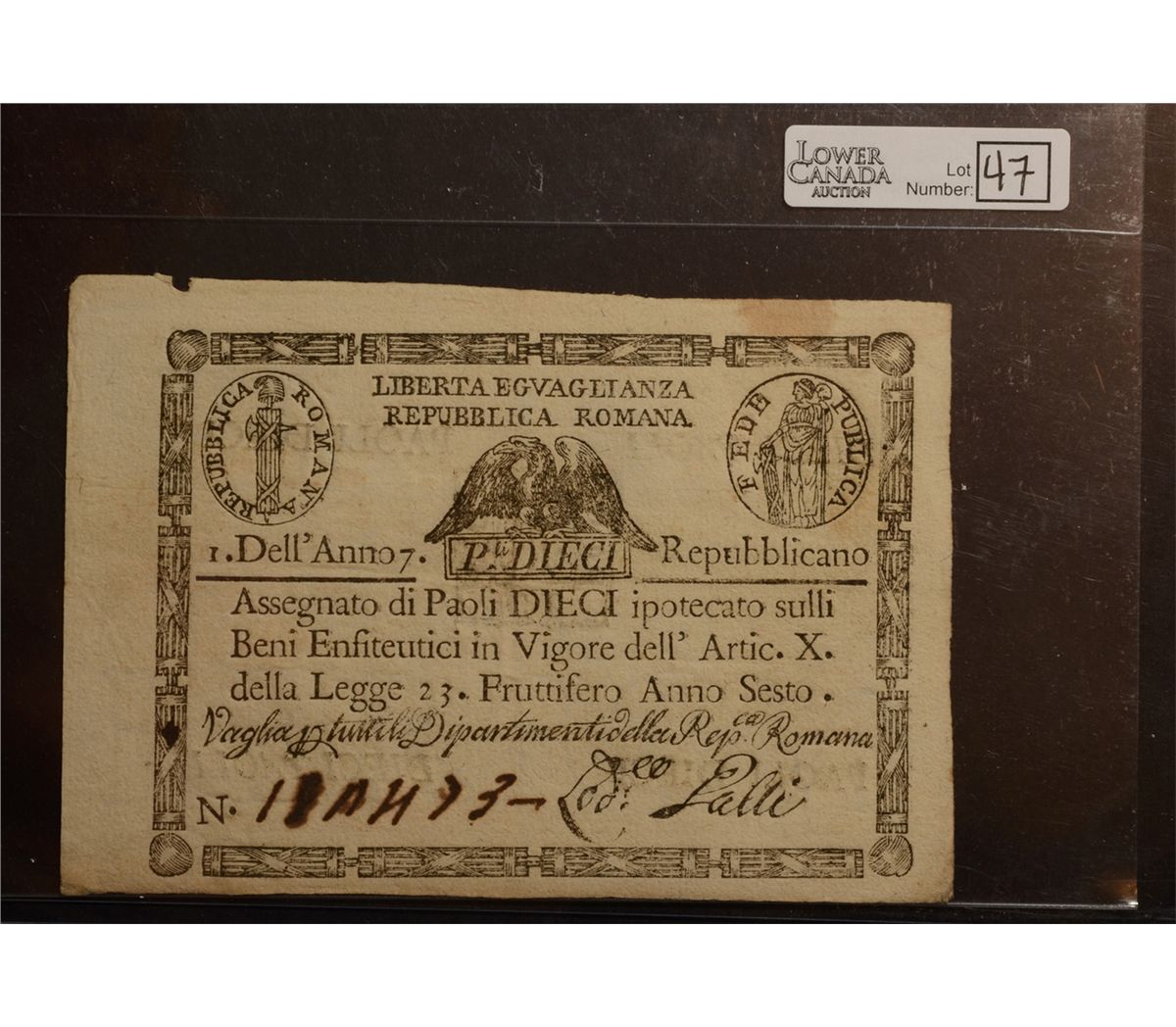 1798, Republica Romana, Assignats Dieci (10) Paoli in Very-Fine/Extra-Fine, value in square on back. S540c