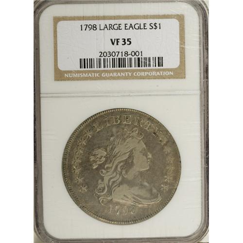 <B>1798 S$1 Five Stripes VF35 NGC.</B></I> B-6, BB-96, R.3. The obverse of this example, which displays light to moderate wear on the dove-gray devices, has slate-gray fields, while the fields take on an orange-gold tone on the reverse. Like many representatives of this issue, the present piece has a number of long, thin abrasions, the most notable of which appear on the cheek and in the field above the eagle.<BR><BR><b>Shipping:</b> Coins & Currency (<a target="_blank" href="http://www.heritageauctions.com/common/shipping.php">view shipping information</a>)