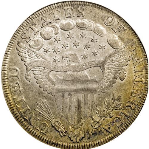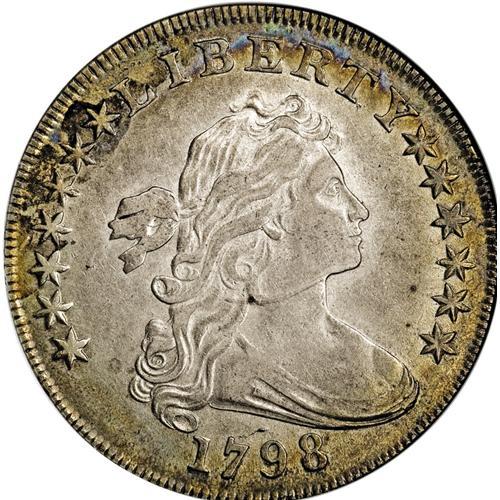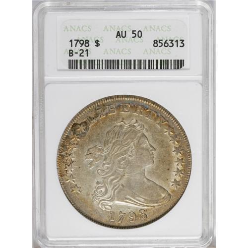 <B>1798 S$1 Large Eagle, 10 Arrows AU50 ANACS.</B></I> B-21, BB-107, R.5. Die State II. Pointed 9, Arc Star Pattern. Die chip over left edge of 9; only 10 arrows. The Bolender-21 die combination is another of many scarce and rare varieties within the 1798 Heraldic Eagle series. With just 10 arrows on the reverse, it is also an important <I>Guide Book</B></I> variety. A splendid specimen with ivory surfaces highlighted by peripheral gold, blue, and iridescent toning. Considerable luster remains on both sides. Slight surface roughness is evident only upon close examination. This example is a candidate for resubmission. It would not surprise us to learn of a higher grade.<BR><I>Ex: Harry Laibstain (10/2003).</B></I><BR><I>From The William Luebke Collection.</B></I><BR><BR><b>Shipping:</b> Coin/Currency (<a target="_blank" href="http://www.heritageauctions.com/common/shipping.php">view shipping information</a>)