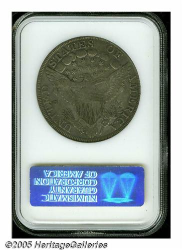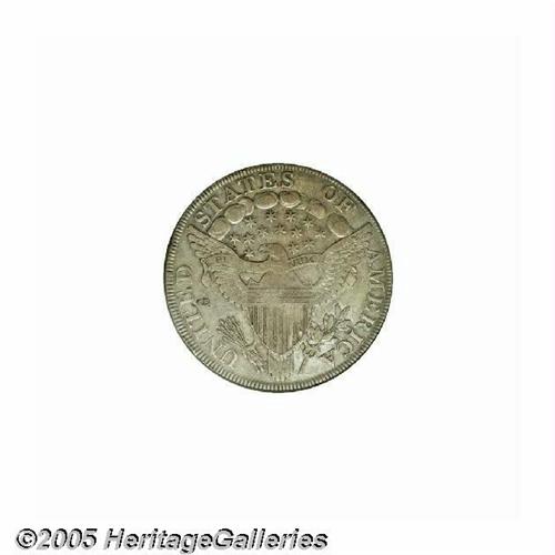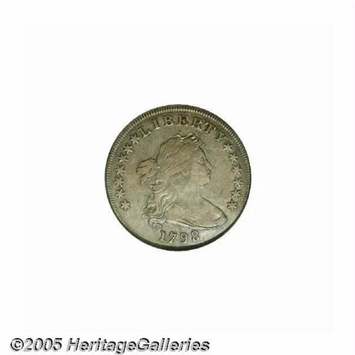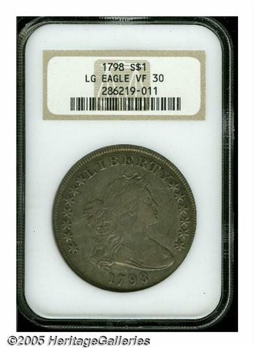 <B>1798<S$1> Large Eagle, 10 Arrows VF30 NGC.</B></I> B-21, BB-107. R.4. The obverse die used on this variety can be identified by the die lump above 79 between the date and the bust of Liberty. This obverse die was mated to two other reverse dies to create 1798 B-18, BB-103 and B-20, BB-102. This coin was struck from an intermediate state of the reverse die showing a thin die crack along right wing tip, top of AM, to border above F. The surfaces are medium silver-gray overall with darker charcoal accents and some wear showing over the highpoints of Liberty and the eagle.<BR><I>From The Stig Ericsson Collection.</B></I>