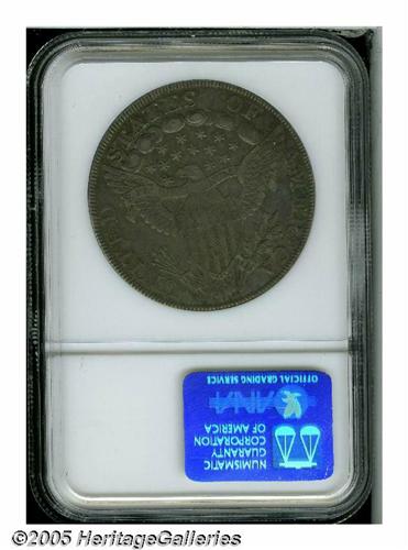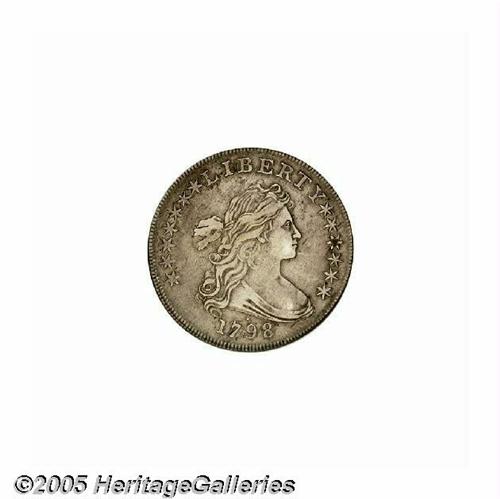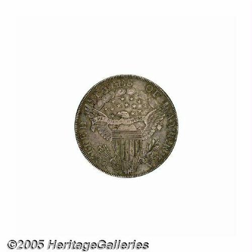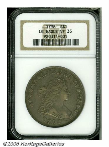 <B>1798<S$1> Large Eagle, 10 Arrows VF35 NGC.</B></I> B-21, BB-107, R.4. A scarcer variety distinguished by a small die lump between the center of the date and the bust, and an "arc" star pattern on the reverse. The surfaces are a pleasing medium-gray and minimally abraded. A small planchet "dig" is noted between IB of LIBERTY. Most of Liberty's hair strands, with the exception of those adjacent to the forehead and shoulder, are nicely defined. Most of the motto on the eagle's ribbon is clear, with the exception of the letters closest to the neck which are weak.