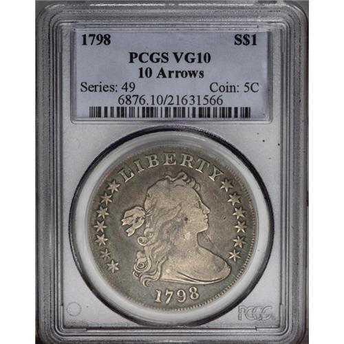 <B>1798<img border='0' src='http://www.heritagecoins.com/images/star.gif' width=10 height=10>$1> Large Eagle, 10 Arrows VG10 PCGS.</B></I> B-13, BB-108, R.3. Nicely detailed for the grade despite softness on the UN in UNITED. A slate-gray example with a narrow lamination (as made) beneath the chin and some wispy hairlines near the eagle's head. <BR><BR><B>Important notice:</B> Heritage usually auctions material at the rate of 200-250 lots per hour. On some occasions eBay Live bid software or the Internet may not be able to keep up with the pace of the auction. We recommend placing a realistic absentee bid now as insurance to avoid disappointment. Occasionally the auctioneer may eliminate or reject an eBay Live bid, and the auctioneer may also reopen a lot after the close of the eBay live bidding (usually because we missed an audience bid), and may reject your bid even if it shows you as the winning bidder. By bidding via eBay Live, you agree that Heritage may award the lot to another bidder at its sole discretion under the circumstances described above or any other reasonable circumstances. Since eBay bids are not shown to us until we open the lot on the floor, we treat those bids just like floor bids. In most cases the floor responds before the eBay bid is presented to us, due to Internet lag time, so for consistency we have made it a policy that floor bids are always considered first over tie eBay live bids. Also please note that all Heritage lots purchased through eBay Live carry a 20% Buyer's Premium. Please make sure you read the Terms and Conditions before you bid. This lot is being auctioned in conjunction with a live floor auction by Heritage Galleries & Auctioneers. All final auction and invoice information will be supplied by Heritage Galleries & Auctioneers, and all other information should be considered preliminary. Lot:2127 <BR><BR><B>Winning Notification and Billing:</B> After the FINAL session in this auction is complete, Heritage will send e-mail and snail mail invoices. This process normally takes several days. All final auction and invoice information will be supplied by Heritage Galleries & Auctioneers, and all other information should be considered preliminary. <BR><BR>This auction will be conducted on a live auction floor and over the Internet through eBay Live. If you choose to place an absentee bid, please take a moment to <font color='#0000ff'><u><a href='http://pages.ebay.com/liveauctions/help/before/laabsentee.html'>learn how eBay Live absentee bidding works</a></u></font><font color='#000000'>