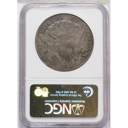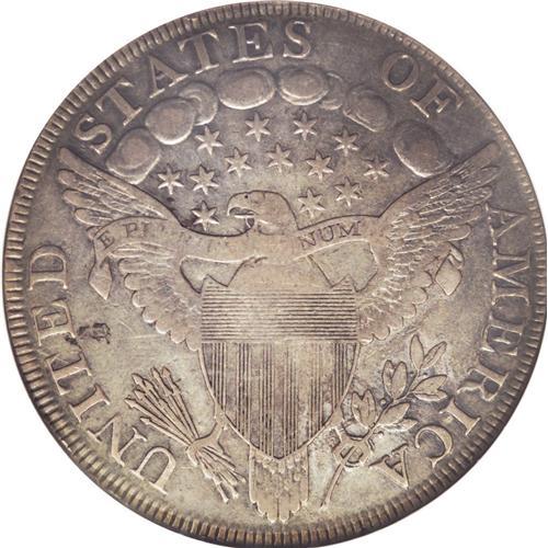 <B>1798<img border='0' src='http://www.heritagecoins.com/images/star.gif' width=10 height=10>$1> Large Eagle, 10 Arrows XF40 NGC.</B></I> B-21, BB-107, R.4. A scarce Bolender variety identified by a die lump above the 9 in the date and only ten arrow heads on the reverse. Golden-brown and sky-blue tints enrich this partly satiny representative. Relatively unabraded despite a pair of unimportant rim nicks near 7:30 on the reverse.