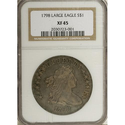 <B>1798 S$1 Large Eagle, 10 Arrows XF45 NGC.</B></I> B-13, BB-108, R.3. Rose-gray in color, this is an unusually well-detailed piece which appears to be denied an even higher grade only due to a lack of remaining luster. The surfaces are smooth for the grade, with the exception of adjustment marks in the center of the obverse, which are of mint origin and common on 18th century coinage.<BR><BR><b>Shipping:</b> Coins & Currency (<a target="_blank" href="http://www.heritageauctions.com/common/shipping.php">view shipping information</a>)