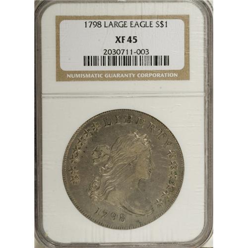 <B>1798 S$1 Large Eagle, 10 Arrows XF45 NGC.</B></I> B-13, BB-108, R.3. In addition to a reduced number of arrows, this die marriage can be recognized by a die chip between the bust and star 13. Natural gunmetal-gray and golden surfaces retain glimpses of luster in the recesses. A couple of minor thin abrasions are of little concern. Mint-made adjustment marks are noted at the centers.<BR><BR><b>Shipping:</b> Coins & Currency (<a target="_blank" href="http://www.heritageauctions.com/common/shipping.php">view shipping information</a>)
