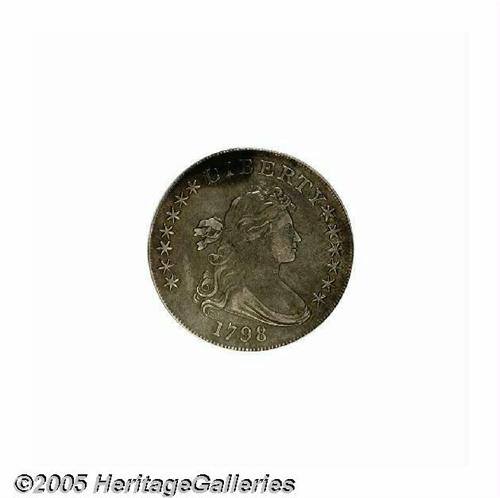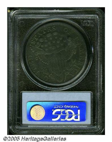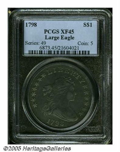<B>1798<S$1> Large Eagle, 10 Arrows XF45 PCGS.</B></I> B-13, BB-108, R.5. A die crack extends through the upper portion of AME and the reverse die shows moderate wear along the edge. On the obverse there is a thin die crack from below the date up through the first three stars. Identifiable by a die lump which extends up from the lower serif of the L in LIBERTY, and a die lump between the final stars inside point and Liberty's upper drapery. Deep gunmetal gray patina, with charcoal color at the right side of the obverse. Well struck throughout and identifiable by a small nick on the inside point of the eighth star and a nick at the top of the I of UNITED.