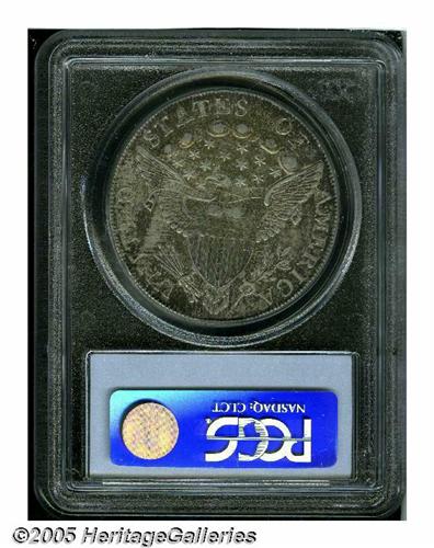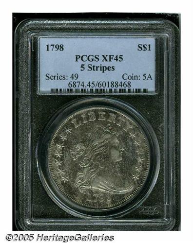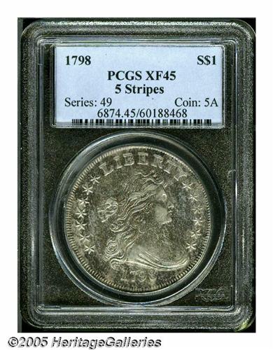 <B>1798<S$1> Large Eagle, 10 Arrows XF45 PCGS.</B></I> B-6, BB-96, R.2. The B-6 is characterized by a comma-like defect after the compact date, and five lines in each shield element. Generally not located above the VF level, this is a pleasing, minimally worn example that has bright accents over the highpoints of the devices and mottled sea-green and violet toning in the recessed areas. Lightly abraded in general with the most obvious marks being an X in the lower left obverse field.