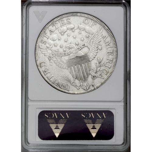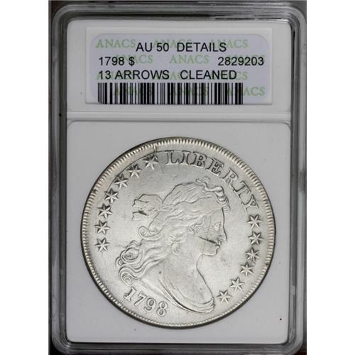 <B>1798<img border='0' src='http://www.heritagecoins.com/images/star.gif' width=10 height=10>$1> Large Eagle, 13 Arrows--Cleaned--ANACS. AU50 Details.</B></I> B-24, BB-124, R.2. Bolender-24 is one of Bowers' "Blundered Stars Reverse" varieties, because two of the highest stars on the reverse overlap the clouds. The star nearest the seventh cloud is also widely recut. The reverse die was also used to produce BB-123 and BB-152, while the obverse die, noted for mint-made die lumps after the date, is unique to this marriage. The surfaces are somewhat subdued, the result of having been cleaned. A lateral grease mark is seen over Liberty's cheek, and several scratches are also located on the obverse. Still, a desirable, collectible example.