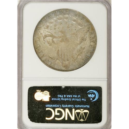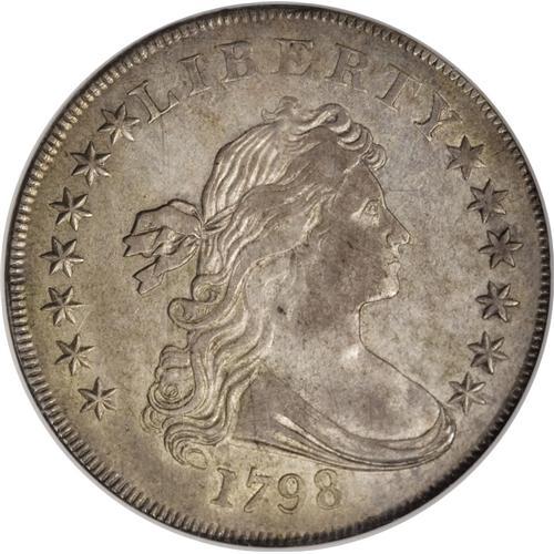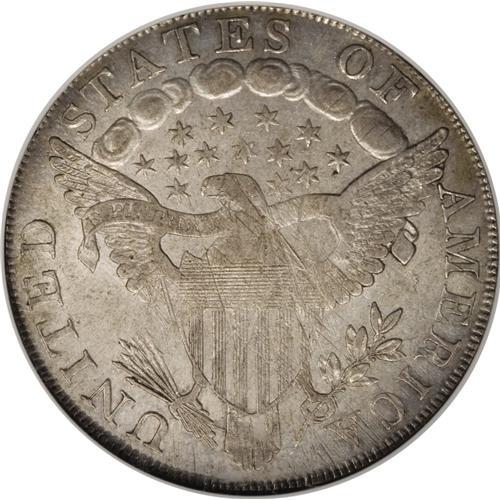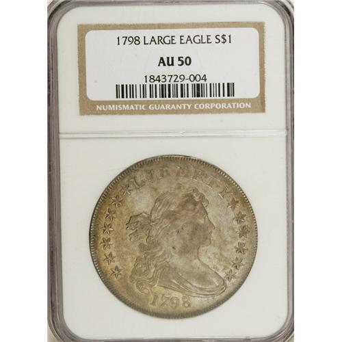 <B>1798 S$1 Large Eagle AU50 NGC.</B></I> B-9, BB-121, R.5. The rarity rating indicates that not more than 75 examples of this variety exist in all grades, and this piece is easily one of the finest. For comparison, the William Leubke collection had just a VF example. The surfaces have satiny luster with medium gray color that is intermingled with olive-gold, lilac, and iridescent color.<BR><BR><b>Shipping:</b> Coins & Currency (<a target="_blank" href="http://www.heritageauctions.com/common/shipping.php">view shipping information</a>)