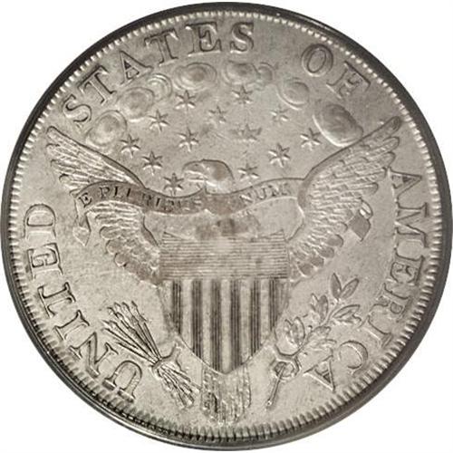 <B>1798<img border='0' src='http://www.heritagecoins.com/images/star.gif' width=10 height=10>$1> Large Eagle AU50 PCGS.</B></I> B-31, BB-115, R.5. The variety is confirmed by: the digit 8 of the date out of position, high and leaning slightly right; a die crack traveling from below the 9 through the two inner points of star 1 and ending in the field; a star close to, but not touching, both upper and lower points of the eagle's beak; a leaf points near the center of the upright of I in AMERICA; and 13 arrows, with the one overlapping the third shaft from the right having a tiny head. Silver-gray surfaces reveal occasional whispers of light tan, and traces of luster in the protected areas. The design elements are well centered on the planchet, and nicely defined, though the middle portion of the eagle's breast displays minor smoothness. Relatively clean surfaces show just a few minute contact marks, mostly in the fields.
