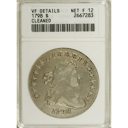 <B>1798 S$1 Large Eagle, 10 Arrows--Cleaned--ANACS. VF Details, Net Fine 12.</B></I> B-13, BB-108, R.3. "Easily identifiable by a die flaw between ray of last star and bust," according to Bowers-Borckardt. This example displays smooth, lightly hairlined surfaces that exhibit pearl-gray color and are free of distracting abrasions. A rim nick is noted near 1 o'clock on the reverse.<BR><BR><b>Shipping:</b> Coins & Currency (<a target="_blank" href="http://www.heritageauctions.com/common/shipping.php">view shipping information</a>)