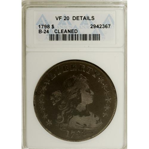 <B>1798 S$1 Large Eagle--Cleaned--ANACS. VF20 Details.</B></I> B-24, BB-124, R.2. Moderately worn with deep chocolate-charcoal patina overall and slate-gray toning at the worn zones. Two significant rim abrasions are noted near 9 o'clock on the glossy obverse.<BR><BR><b>Shipping:</b> Coins & Currency (<a target="_blank" href="http://www.heritageauctions.com/common/shipping.php">view shipping information</a>)