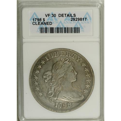<B>1798 S$1 Five Stripes--Cleaned--ANACS. VF30 Details.</B></I> B-4, BB-92, R.5. Predominantly gray-brown with small zones of slate-gray, olive, and charcoal patina. Moderately worn with minor hairlines in the fields.<BR><BR><b>Shipping:</b> Coin/Currency (<a target="_blank" href="http://www.heritageauctions.com/common/shipping.php">view shipping information</a>)