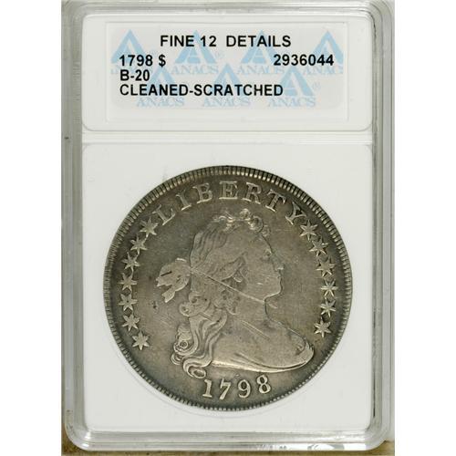 <B>1798 S$1 Large Eagle--Cleaned, Scratched--ANACS. Fine 12 Details.</B></I> B-20, BB-102, R.5. This slate-gray piece is dull from a cleaning and has a thin diagonal scratch across Liberty's neck. The reverse rim has three minor dings between 11 and 12 o'clock. Late dies with an obvious break beneath the eagle's tail and a tornado-shaped break through the RI in AMERICA.<BR><BR><b>Shipping:</b> Coins & Currency (<a target="_blank" href="http://www.heritageauctions.com/common/shipping.php">view shipping information</a>)