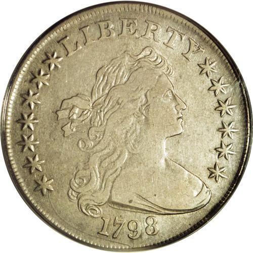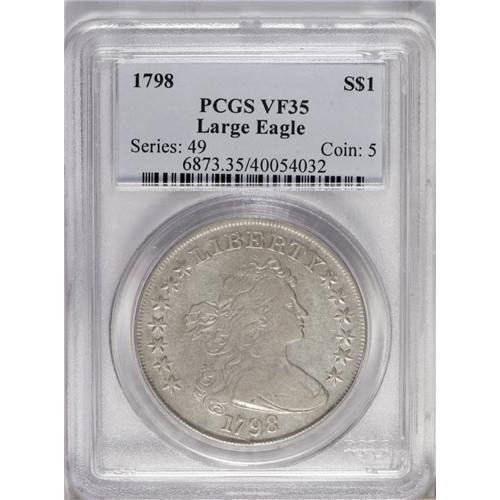 <B>1798 S$1 Large Eagle, Close Date VF35 PCGS.</B></I> B-30, BB-116, R.5. Die State IV. Reiver Die State b, early. Pointed 9, Arc Star Pattern. Digit 8 out of position, high and leaning slightly right; all stars distant from the clouds. Most examples of this rare variety grade VF or XF, much like this specimen. An intermediate die state with a reverse crack from the top of T to the center of E, the lower part of D, the eagle's left wing, and the first two clouds. Another crack joins the tops of D and ST to the tips of the top two feathers in the left wing. Other minor reverse die cracks are also evident. Pleasing light gray surfaces with tiny surface marks and faint hairlines.<BR><I>Ex: Lano Balulescu (8/2001).</B></I><BR><I>From The William Luebke Collection.</B></I><BR><BR><b>Shipping:</b> Coin/Currency (<a target="_blank" href="http://www.heritageauctions.com/common/shipping.php">view shipping information</a>)