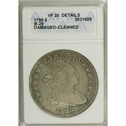 <B>1798 S$1 Large Eagle--Damaged, Cleaned--ANACS. VF20 Details.</B></I> B-29, BB-119, R.4. This Draped Bust dollar is cloudy from hairlines, and has several moderate rim bruises. The portrait has a few tiny roundish digs, and thin marks pass through UNITED and the star near the beak.<BR><BR><b>Shipping:</b> Coins & Currency (<a target="_blank" href="http://www.heritageauctions.com/common/shipping.php">view shipping information</a>)