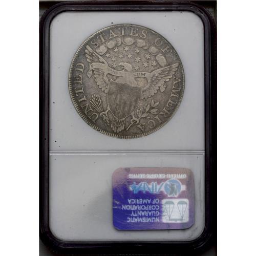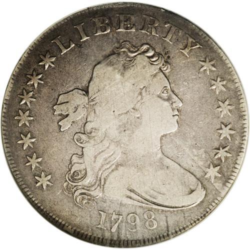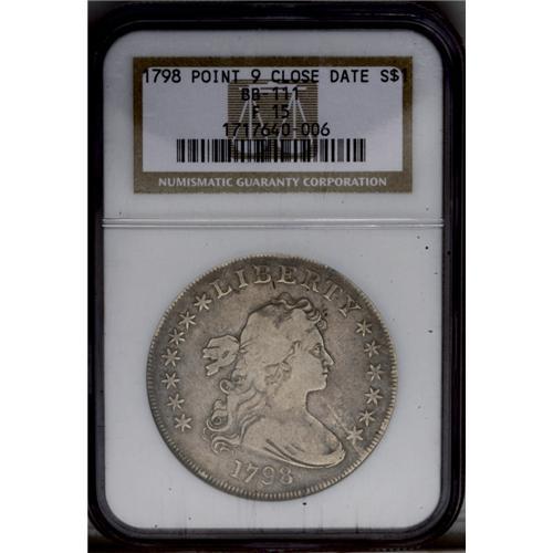 <B>1798<img border='0' src='http://www.heritagecoins.com/images/star.gif' width=10 height=10>$1> Large Eagle Fine 15 NGC.</B></I> B-11, BB-111. High R.3. Intermediate die state with noticeable crack from Liberty's throat, through star 13, and into the border. A much heavier break later develops. The surfaces are a totally natural gunmetal-gray color with attractive golden undertones. Bluntness in the centers is more the result of strike than of wear. <BR><BR><B>Important notice:</B> Heritage usually auctions material at the rate of 200-250 lots per hour. On some occasions eBay Live bid software or the Internet may not be able to keep up with the pace of the auction. We recommend placing a realistic absentee bid now as insurance to avoid disappointment. Occasionally the auctioneer may eliminate or reject an eBay Live bid, and the auctioneer may also reopen a lot after the close of the eBay live bidding (usually because we missed an audience bid), and may reject your bid even if it shows you as the winning bidder. By bidding via eBay Live, you agree that Heritage may award the lot to another bidder at its sole discretion under the circumstances described above or any other reasonable circumstances. Since eBay bids are not shown to us until we open the lot on the floor, we treat those bids just like floor bids. In most cases the floor responds before the eBay bid is presented to us, due to Internet lag time, so for consistency we have made it a policy that floor bids are always considered first over tie eBay live bids. Also please note that all Heritage lots purchased through eBay Live carry a 20% Buyer's Premium. Please make sure you read the Terms and Conditions before you bid. This lot is being auctioned in conjunction with a live floor auction by Heritage Galleries & Auctioneers. All final auction and invoice information will be supplied by Heritage Galleries & Auctioneers, and all other information should be considered preliminary. Lot:2121 <BR><BR><B>Winning Notification and Billing:</B> After the FINAL session in this auction is complete, Heritage will send e-mail and snail mail invoices. This process normally takes several days. All final auction and invoice information will be supplied by Heritage Galleries & Auctioneers, and all other information should be considered preliminary. <BR><BR>This auction will be conducted on a live auction floor and over the Internet through eBay Live. If you choose to place an absentee bid, please take a moment to <font color='#0000ff'><u><a href='http://pages.ebay.com/liveauctions/help/before/laabsentee.html'>learn how eBay Live absentee bidding works</a></u></font><font color='#000000'>
