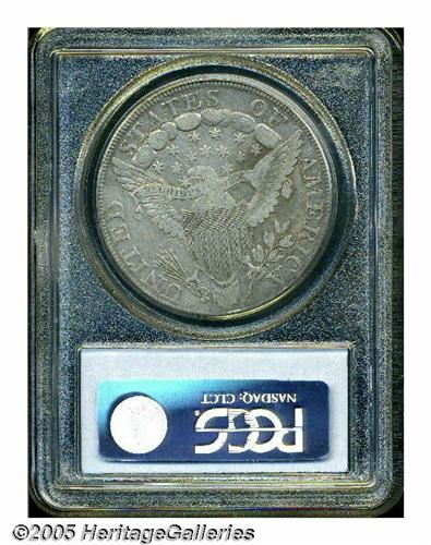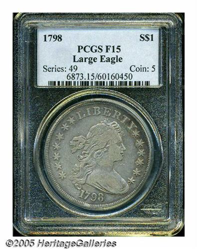 <B>1798<S$1> Large Eagle Fine 15 PCGS.</B></I> B-8, BB-125, R.2. An early die state, all obverse stars are bold, as is UNITED. Lightly toned in battleship-gray and golden hues. The shield lines are fully separated, and most of E PLURIBUS UNUM is sharp. The absence of obtrusive marks confirms the quality for the grade.