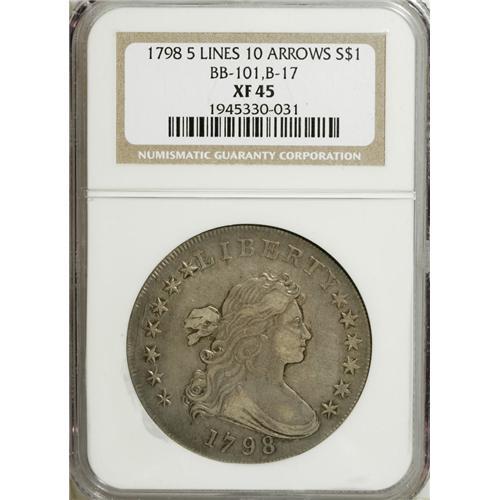<B>1798 S$1 Large Eagle, Five Stripes XF45 NGC.</B></I> B-17, BB-101, High R.5. Die State V. Reiver State c. Pointed 9, Line Star Pattern. Five shield lines, the only Pointed 9 dollar with this feature. Listed in the <I>Guide Book</B></I> as "Pointed 9, Five Vertical Lines" and the only die marriage that matches this description. Thus, anyone who collects early dollars by "Redbook variety" must own an example of this combination. Fortunately, two examples are offered in the present sale. This example is a late die state with die cracks outside the stars to the left, and a pronounced bulge in the left obverse field. <B>Bowers-Borckardt Plate Coin.</B></I> A thin scratch from the nose to star 8 identifies this as the plate coin in the BB reference. Pleasing gray-brown toning with lighter silver color on the devices. Both sides have the usual insignificant imperfections expected on a lightly circulated early dollar. A rare die combination with only about 30 to 40 examples known, despite a higher estimate of 70 to 120 examples by Bowers. This is one of the notable specimens listed in the <I>Silver Dollar Encyclopedia.</B></I> This is a nicely centered specimen with excellent obverse and reverse detail.<BR><I>Ex: Higgins Collection (Bowers and Merena, 1988), lot 2216; Witham and Sansoucy Collections (Bowers and Merena, 9/1992), lot 1404; W. David Perkins; Harry Laibstain (4/2005).</B></I><BR><I>From The William Luebke Collection.</B></I><BR><BR><b>Shipping:</b> Coins & Currency (<a target="_blank" href="http://www.heritageauctions.com/common/shipping.php">view shipping information</a>)