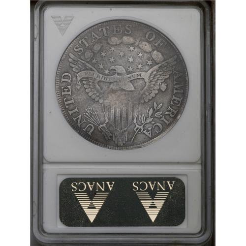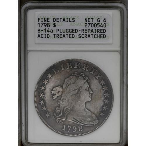 <B>1798<img border='0' src='http://www.heritagecoins.com/images/star.gif' width=10 height=10>$1> Large Eagle--Plugged, Repaired, Acid Treated, Scratched--ANACS. Fine Details, Net Good 6.</B></I> B-14a, BB-122, R.3. The right obverse field is smoothed, and a hole between the BE in LIBERTY has been plugged. This harshly cleaned piece has a sunken appearance along the left obverse border from an acid application, and a vertical scratch beneath the AM in AMERICA is also noted.