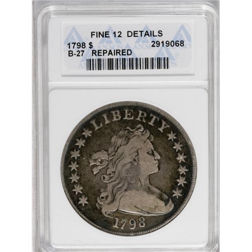 <B>1798 S$1 Large Eagle--Repaired--ANACS. Fine 12 Details.</B></I> B-27, BB-113, R.2. The variety is attributed by the following: the 8 in the date is high and leans to the right, and the highest curl of hair under the E in LIBERTY is incomplete; on the reverse a leaf tip terminates between RI in AMERICA, and the F in OF is mostly to the right of a space between two clouds. Light to medium gray patination displays slightly deeper hues on the obverse, whose design features reveal somewhat more detail than the reverse. A few abrasions are scattered about, as one would expect for the grade level. Some light smoothing appears to have been conducted in the lower right obverse field, but any other "repairs" are not readily evident, and if undertaken, are extremely deceptive.<BR><BR><b>Shipping:</b> Coin/Currency (<a target="_blank" href="http://www.heritageauctions.com/common/shipping.php">view shipping information</a>)