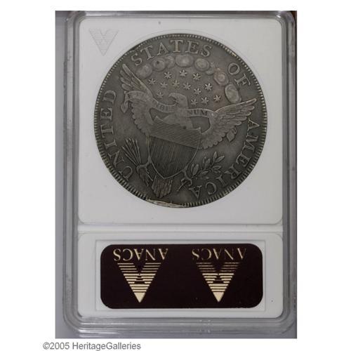 <B>1798<S$1> Large Eagle--Repaired--ANACS. VF Details, Net Fine 12.</B></I> B-20, BB-102, R.5. Die State IV. A very scarce die marriage, most likely the sizable die break on the reverse at 6 o'clock led to a prompt replacement of the reverse die. Liberty's neck, jaw, and upper cleavage has been repaired, obvious only when viewed beneath a loupe. A few minor rim dings are also noted. A relatively sharp deep dove-gray piece.