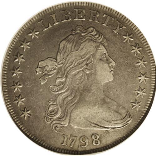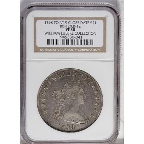 <B>1798 S$1 Large Eagle, Wide Date VF30 NGC.</B></I> B-12, BB-120, R.4. Die State IV. Reiver State b (14). Pointed 9, Line Star Pattern. Digit 8 well below drapery, closer to the border, and this is diagnostic for the 1798 silver dollars of this group. The obverse die is shattered with several cracks, while the reverse shows die failure among the stars to the upper right. Although it is not the same coin, this example appears to be in the same die state as lot 1233 in the Gilhousen Collection, described by Dave Bowers as the terminal die state for the variety. Every one of the 14 die cracks described by Jules Reiver in his update of the Bolender reference is present on this specimen. Considerable lilac-gray color is evident in the fields with light silver-gray on the devices. Pleasing surfaces with the usual minor abrasions scattered about each side. Although this is not a rare variety, it remains scarce and is solidly in the R.4 range. It is also an important late or terminal die state of the variety.<BR><I>Ex: eBay (1/2002).</B></I><BR><I>From The William Luebke Collection.</B></I><BR><BR><b>Shipping:</b> Coin/Currency (<a target="_blank" href="http://www.heritageauctions.com/common/shipping.php">view shipping information</a>)