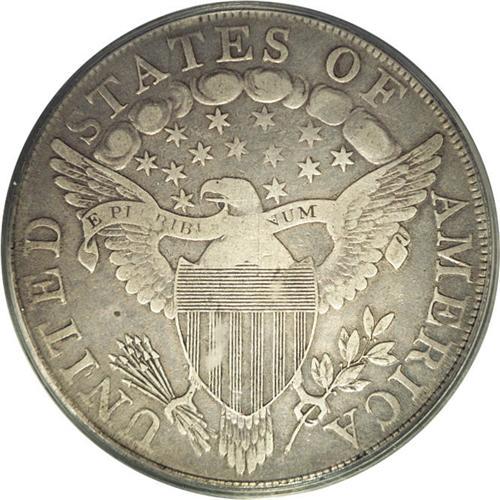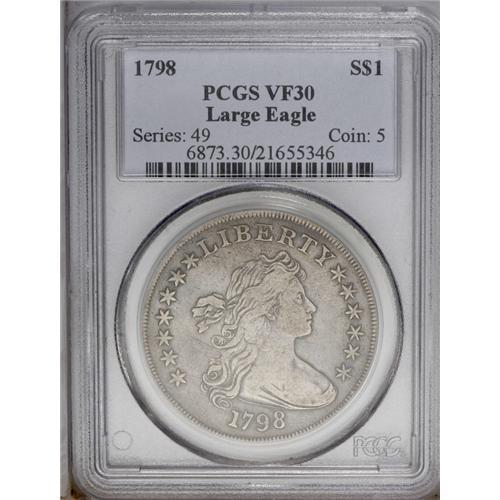 <B>1798<img border='0' src='http://www.heritagecoins.com/images/star.gif' width=10 height=10>$1> Large Eagle VF30 PCGS.</B></I> B-27, BB-113, R.2. This variety marks the initial use of what later became a much overworked obverse die, with a high 8 in the date that tilts slightly to the right. Light-gray over the central devices, with medium-gray toning in the fields. Well struck over most of the devices with the only noticeable weakness being on the eagle's breast and head, and, of course, some even highpoint wear which is consistent with the grade assessment. Light adjustment marks are noted across the portrait and into the right obverse field, and a small abrasion rests directly beneath the L in LIBERTY. This coin is particularly desirable because of its distinctly original appearance.