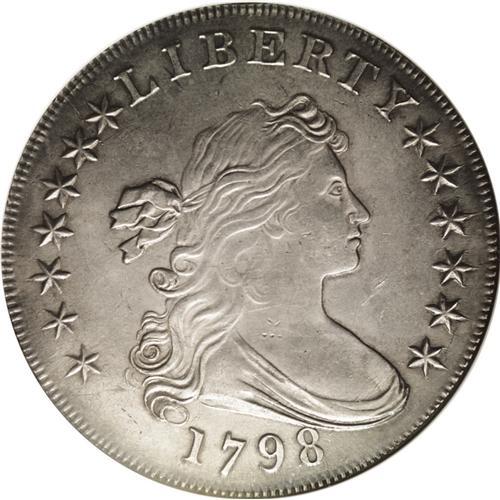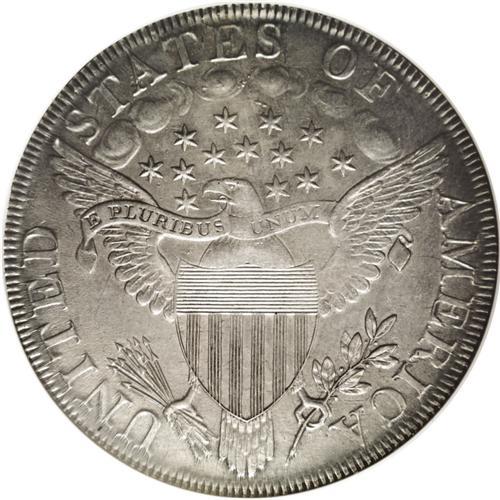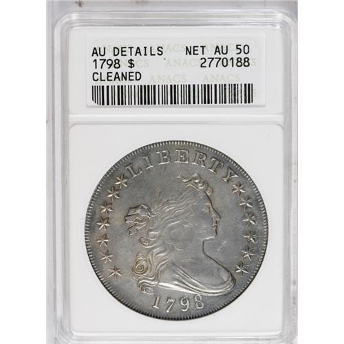 <B>1798<img border='0' src='http://www.heritagecoins.com/images/star.gif' width=10 height=10>$1> Large Eagle, Wide Date--Cleaned--ANACS. AU Details, Net AU50.</B></I> B-23, BB-105, R.3. Most easily attributed by the positioning of the 7 and 8 in the date on the obverse, and on the reverse by the various planchet flaws scattered over that side. The steel-gray surfaces show brilliantish accents from the stated cleaning. Generally a nice coin with some light wear on each side.