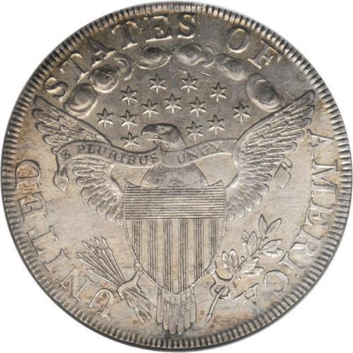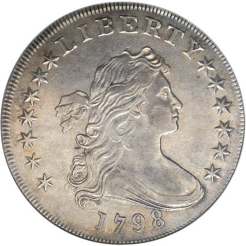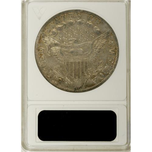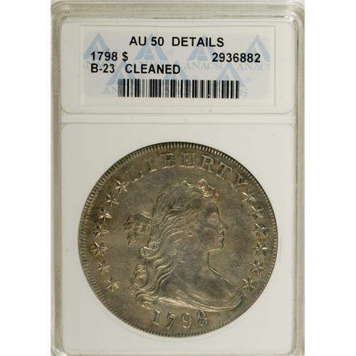<B>1798 S$1 Large Eagle, Wide Date--Cleaned--ANACS. AU50 Details.</B></I> B-23, BB-105, R.3. This sky-blue and almond-gold Heraldic Eagle dollar is a bit glossy, but the remaining luster is extensive, and Liberty's hair and the eagle's wings display nearly all of their original detail. Likely, the majority of early dollars have been cleaned at one time or another, and the present piece is undeniably more desirable than most.<BR><BR><b>Shipping:</b> Coins & Currency (<a target="_blank" href="http://www.heritageauctions.com/common/shipping.php">view shipping information</a>)