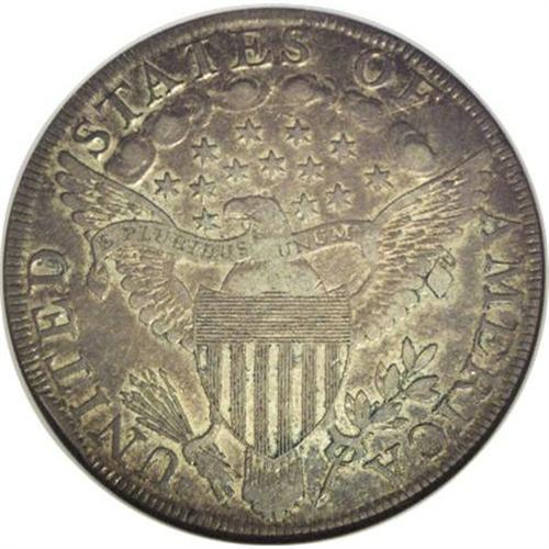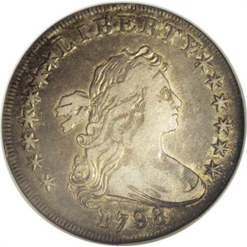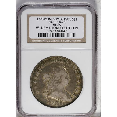 <B>1798 S$1 Large Eagle, Wide Date, High 8 VF25 NGC.</B></I> B-23, BB-105, R.3. Die State III. Reiver Die State b. Pointed 9, Arc Star Pattern. Top of 8 joins bust, corrugated die chip between TE of STATES. This die combination is one of the most easily located of all 1798 Heraldic Eagle varieties. It is a transitional variety with the obverse used for B-22 before its use here, and the reverse used on this variety first and later used for B-19, thus establishing the emission sequence for these three varieties. For any series of coins, the emission sequence attempts to state order in which these coins were originally minted. Many numismatists have attempted to make such a determination for most series of early U.S. coins from half cents to eagles. For early dollars, the Bowers-Borckardt numbering system follows a proposed emission sequence for these coins. One possibility that has not been discussed before (to the best of our knowledge) is multiple presses simultaneously striking the same denomination. What if this occurred?<BR> Vivid olive and golden-brown toning surrounds lighter silver color on the central obverse motif. The reverse is similar, although the eagle is toned much like the balance of this piece. Traces of luster remain visible, especially on the reverse.<BR><I>Ex: Stack's (5/2001).</B></I><BR><I>From The William Luebke Collection.</B></I><BR><BR><b>Shipping:</b> Coin/Currency (<a target="_blank" href="http://www.heritageauctions.com/common/shipping.php">view shipping information</a>)