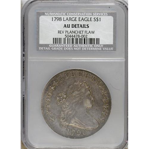 <B>1798 S$1 Large Eagle, Wide Date--Reverse Planchet Flaw-NCS. AU Details.</B></I> B-23, BB-105, R.3. The surfaces are attractive with lilac-gray color and iridescent toning on each side. Traces of luster can still be seen beneath the toning. The reverse has a prominent planchet flaw at the border over UNI, a feature that should be useful to track the pedigree of this specimen.<BR><BR><b>Shipping:</b> Coins & Currency (<a target="_blank" href="http://www.heritageauctions.com/common/shipping.php">view shipping information</a>)