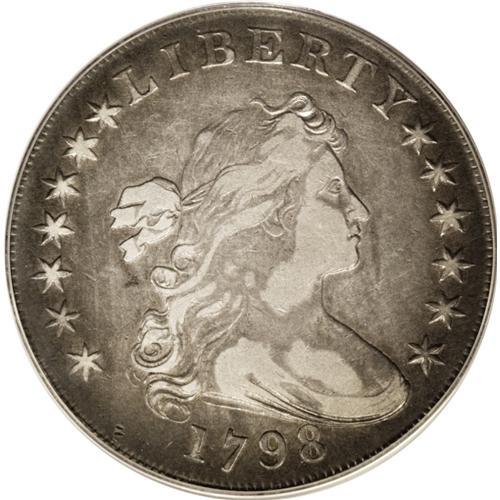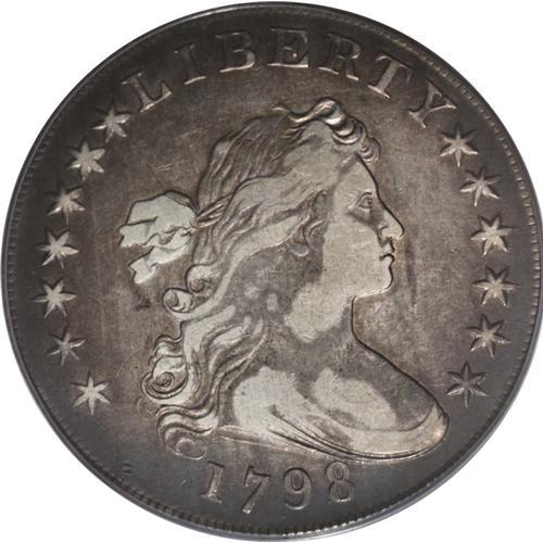 <B>1798 S$1 Large Eagle, Wide Date VF30 PCGS.</B></I> B-23, BB-105, R.3. An attractive dollar with a mixture of pewter-gray, golden-brown, and steel-blue color in the fields. The devices have lighter silver color. While the obverse is VF30, the reverse appears finer and may be fully XF in grade. Although lightly circulated, the surfaces are exceptional quality for the grade.<BR><BR><b>Shipping:</b> Coin/Currency (<a target="_blank" href="http://www.heritageauctions.com/common/shipping.php">view shipping information</a>)