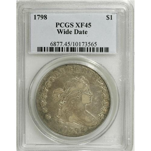 <B>1798 S$1 Large Eagle, Wide Date XF45 PCGS.</B></I> B-23, BB-105, R.3. Glimmers of luster illuminate the stars, letters, wings, and hair. All design details are bold aside from the star centers, and Liberty has only moderate wear on her cheek and shoulder. Careful scrutiny with the aid of a loupe fails to locate consequential contact. A worthy 1798 dollar.<BR><BR><b>Shipping:</b> Coins & Currency (<a target="_blank" href="http://www.heritageauctions.com/common/shipping.php">view shipping information</a>)