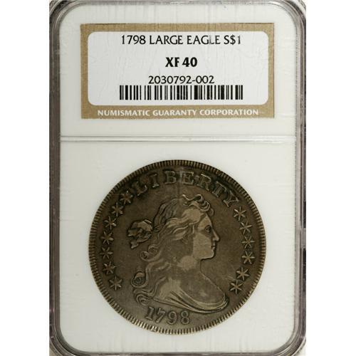 <B>1798 S$1 Large Eagle XF40 NGC.</B></I> B-24, BB-124, R.2. A deep dove-gray piece with lighter slate-gray toning on the highpoints. Minor silver-gray debris is noted within the shield. Impressively defined for the grade. Neither side possesses any noticeable marks, and tiny obverse rim nicks at 4 o'clock and 6:30 are mentioned solely as identifiers.<BR><BR><b>Shipping:</b> Coin/Currency (<a target="_blank" href="http://www.heritageauctions.com/common/shipping.php">view shipping information</a>)