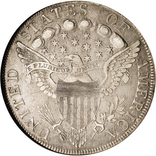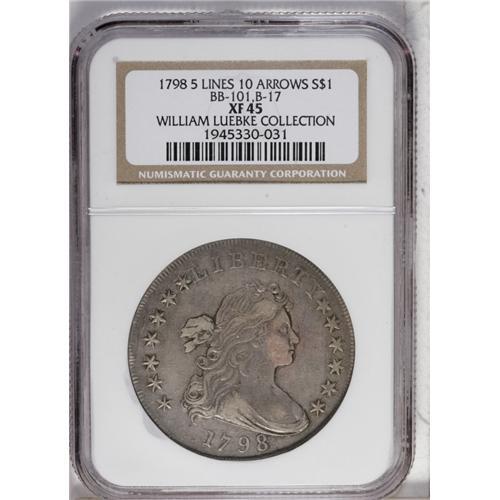 <B>1798 S$1 Large Eagle, Five Stripes XF45 NGC.</B></I> B-17, BB-101, High R.5. Die State V. Reiver State c. Pointed 9, Line Star Pattern. Five shield lines, the only Pointed 9 dollar with this feature. Listed in the <I>Guide Book</B></I> as "Pointed 9, Five Vertical Lines" and the only die marriage that matches this description. Thus, anyone who collects early dollars by "Redbook variety" must own an example of this combination. Fortunately, two examples are offered in the present sale. This example is a late die state with die cracks outside the stars to the left, and a pronounced bulge in the left obverse field. <B>Bowers-Borckardt Plate Coin.</B></I> A thin scratch from the nose to star 8 identifies this as the plate coin in the BB reference. Pleasing gray-brown toning with lighter silver color on the devices. Both sides have the usual insignificant imperfections expected on a lightly circulated early dollar. A rare die combination with only about 30 to 40 examples known, despite a higher estimate of 70 to 120 examples by Bowers. This is one of the notable specimens listed in the <I>Silver Dollar Encyclopedia.</B></I> This is a nicely centered specimen with excellent obverse and reverse detail.<BR><I>Ex: Higgins Collection (Bowers and Merena, 1988), lot 2216; Witham and Sansoucy Collections (Bowers and Merena, 9/1992), lot 1404; W. David Perkins; Harry Laibstain (4/2005).</B></I><BR><I>From The William Luebke Collection.</B></I><BR><BR><b>Shipping:</b> Coin/Currency (<a target="_blank" href="http://www.heritageauctions.com/common/shipping.php">view shipping information</a>)