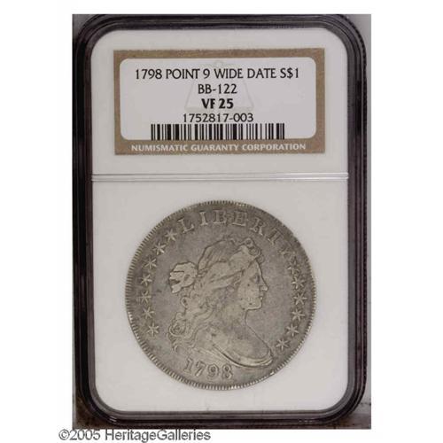 1798 S$1 Pointed 9, Wide Date VF25 NGC. B-14, BB-122, 1798[S$1] Pointed 9, Wide Date VF25 NGC.