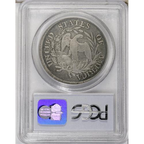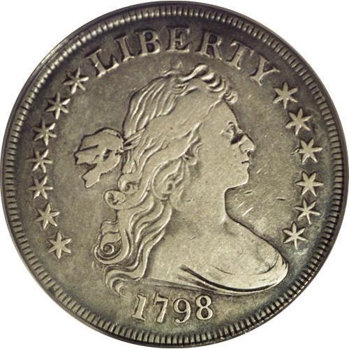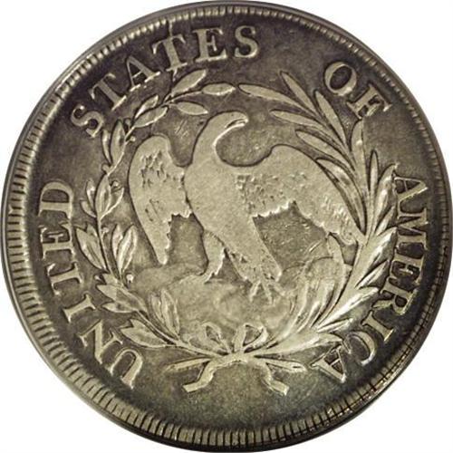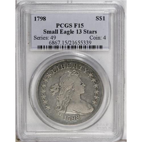 <B>1798 S$1 Small Eagle, 13 Stars Fine 15 PCGS.</B></I> B-1, BB-82, R.3. Die State III. Reiver State b. Seven stars right; paired berries below left side of first S. This die state with extensive reverse die cracks is also known as Bolender-1a. Attractive pewter-gray surfaces with darker gray color at the borders, and lighter silver-gray devices. The usual scattered abrasions are evident on each side. The obverse has a small mark on the bridge of Liberty's nose. This is truly a transitional variety, as the obverse die was reused with a Heraldic Eagle reverse die. A point to ponder, and possibly the subject for an article: How many obverse or reverse dies within the entire scope of U.S. coinage were used for two different coinage design types?<BR><I>Ex: Harry Laibstain (3/2003).</B></I><BR><I>From The William Luebke Collection.</B></I><BR><BR><b>Shipping:</b> Coin/Currency (<a target="_blank" href="http://www.heritageauctions.com/common/shipping.php">view shipping information</a>)